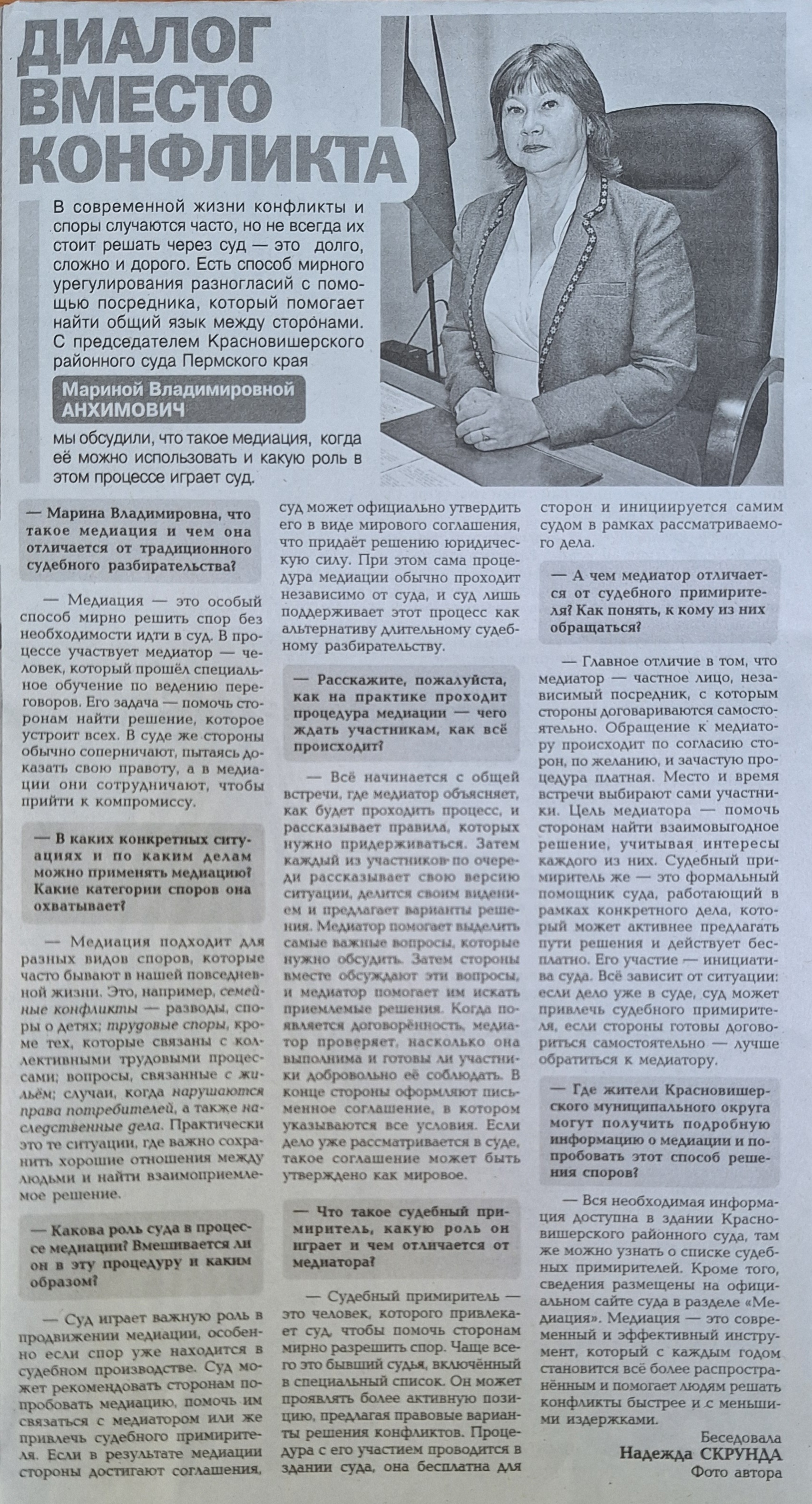 | Диалог вместо конфликта. (Интервью председателя Красновишерского районного суда). Газета Красная Вишера от 01.10.2025 № 40 | версия для печати |